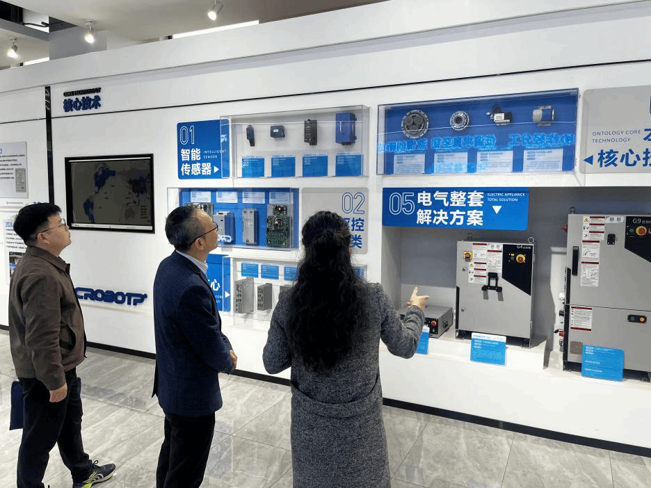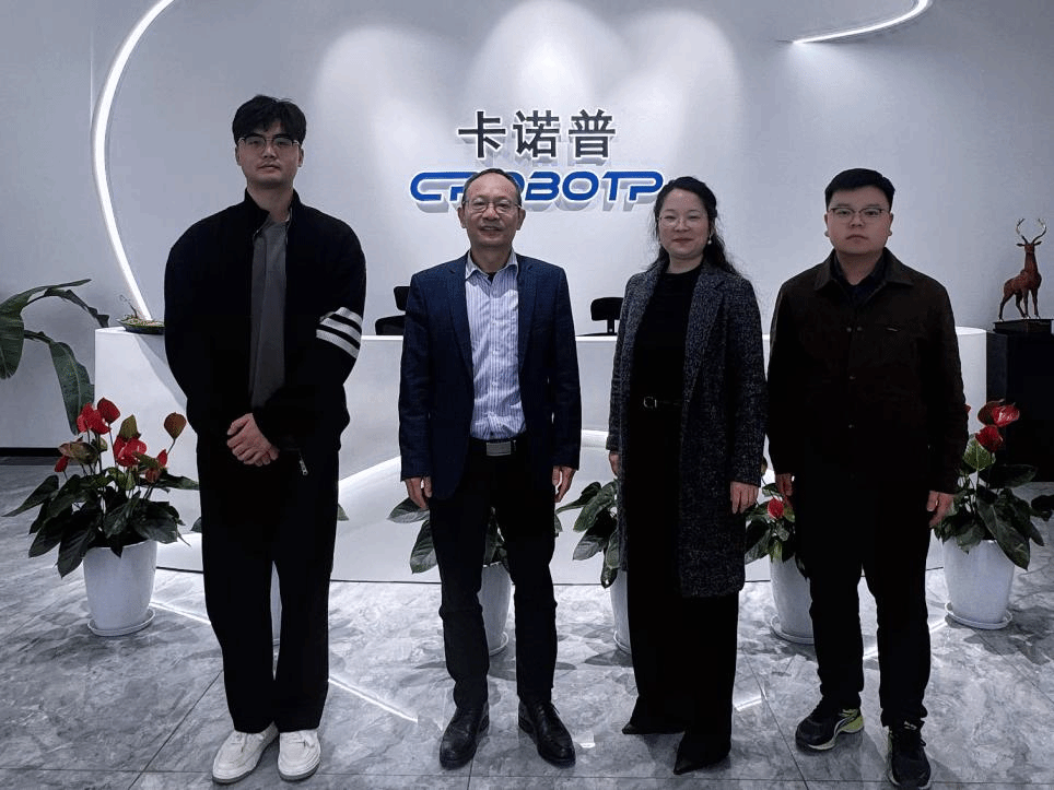 随后,调研团队前往国产工业机器人领域的先锋企业——卡诺普。作为深耕行业十余年的专精特新企业,卡诺普在核心技术研发、全产业链布局及校企合作方面积累了丰富经验。在企业负责人的陪同下,黄勤陆一行首先走进产品展厅,近距离观摩焊接机器人、协作机器人等系列核心产品,详细了解CRP-RH系列六轴机器人的技术参数、精度控制及在汽车制造、3C电子等领域的应用成效。毛露露老师结合电气工程专业课程设置,就机器人控制系统的教学实践方向与企业技术人员深入交流;赵晨宽老师则聚焦工业机器人课程内容优化,重点询问了产品实操培训的核心要点。
