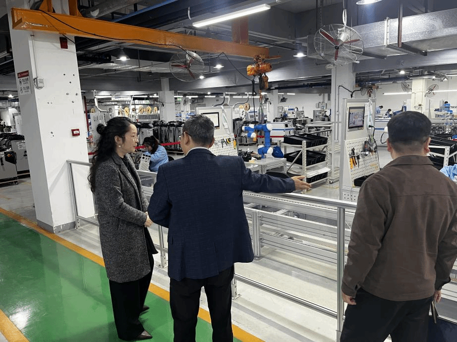 在卡诺普智能生产车间,自动化生产线正高速运转,机器人精准完成组装、检测等工序,展现出年产3亿元的硬核产能。黄勤陆一行沿生产线仔细观摩,重点了解生产流程中的技术标准与人才需求,对企业“自主研发+智能制造”的发展模式给予充分肯定。黄勤陆在调研中强调:职业教育的生命力在于与产业同频共振,这些生产现场的真实需求,正是学院优化人才培养方案的核心依据。