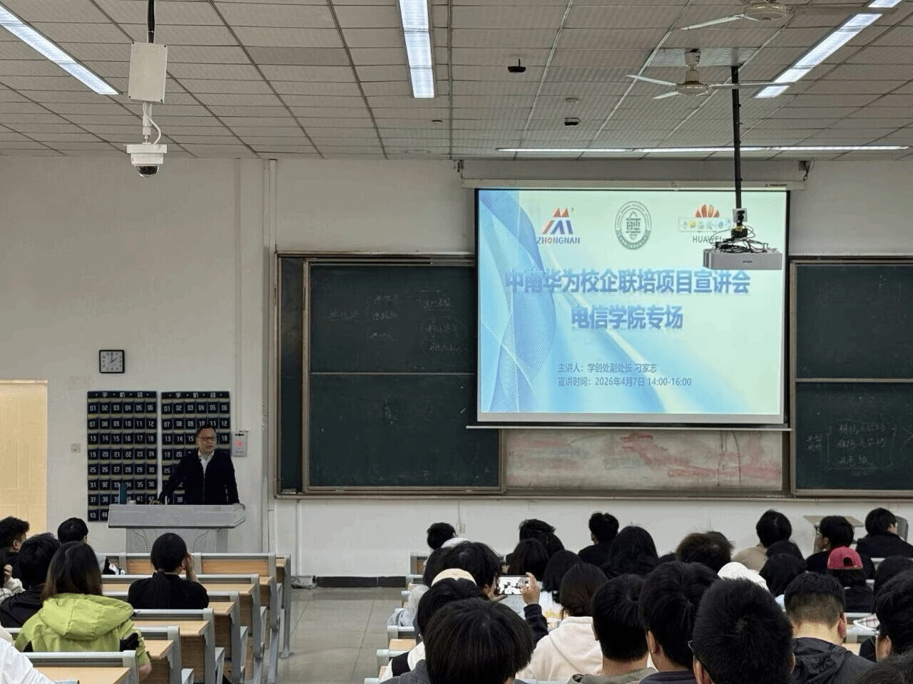 4月7日下午,电信学院在致知楼C101教室举办中南华为订单班专场宣讲会。学院特邀学创处副处长刁家志担任主讲,学院党总支书记阮文韬、专业负责人、辅导员及全体2025级新生参加活动。